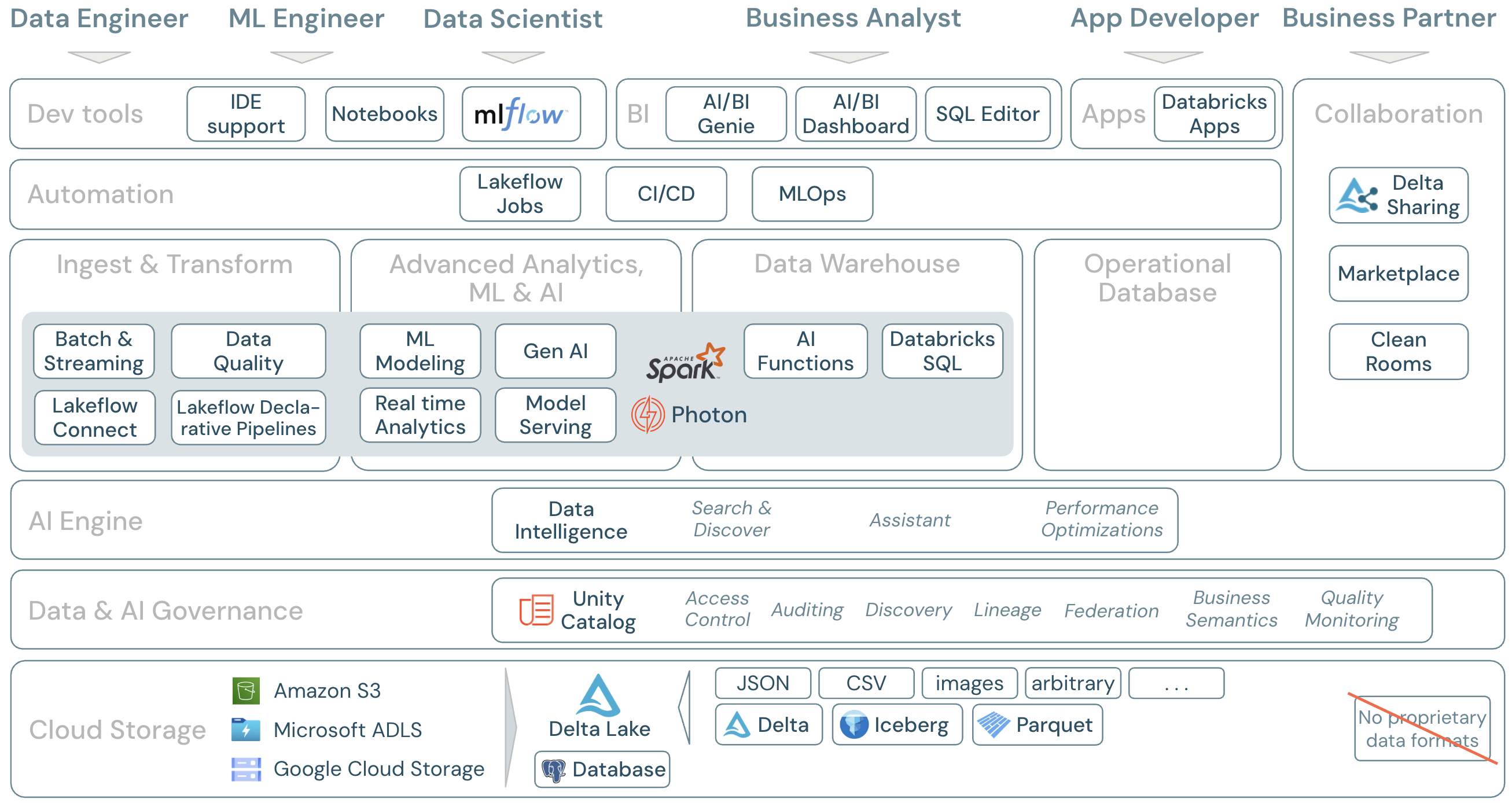 Arkkitehtuuri: Spark-pohjainen, pilviriippumaton (multi-cloud). Keskiössä Delta Lake ja MLflow.