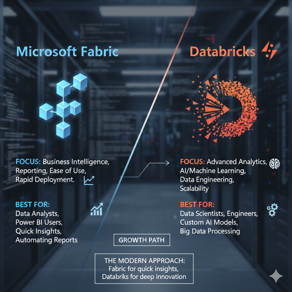Yhteenveto: Fabric soveltuu nopeaan BI-kehitykseen ja datan yhtenäistämiseen. Databricks on valinta ennakoivaan analytiikkaan ja raskaaseen laskentaan.